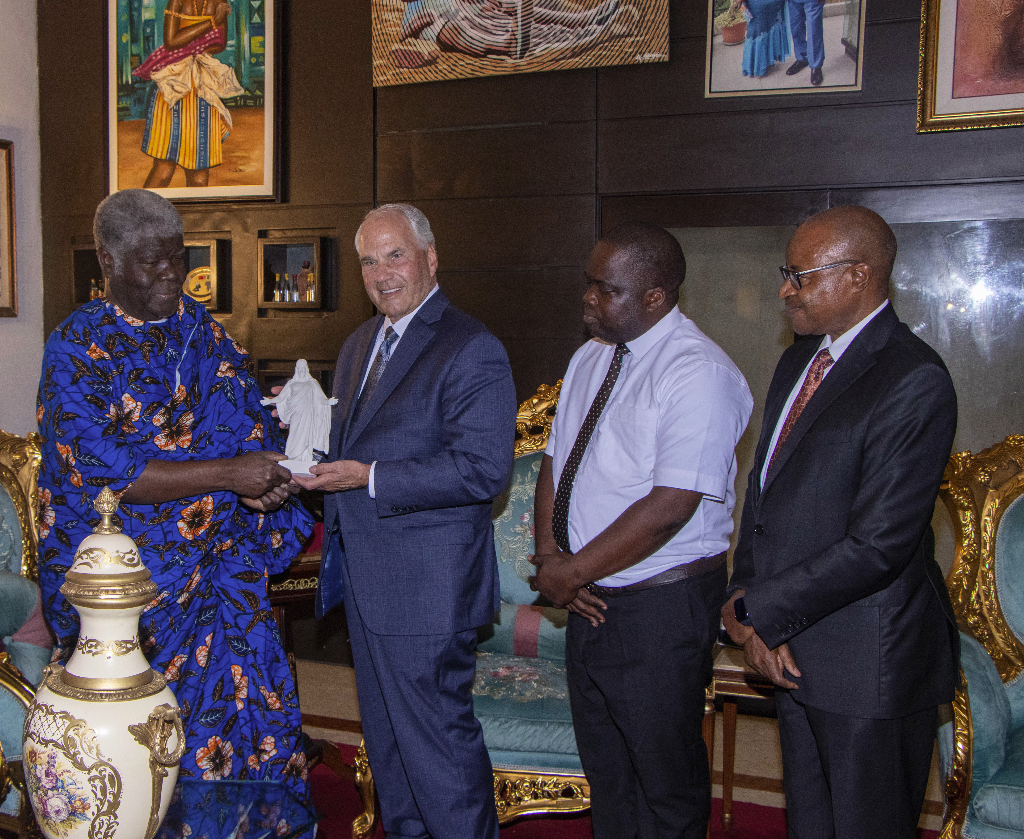 Elder Ronald A. Rasband vom Kollegium der Zwölf Apostel schenkt Premierminister Robert Beugré Mambé von der Elfenbeinküste am Samstag, dem 24. Mai 2025, in dessen Privatresidenz in Abidjan eine kleine Christus-Statue.2025 Intellectual Reserve, Inc. Alle Rechte vorbehalten.Die Apostel forderten die Menschen auch auf, die Lehren Christi dadurch zu befolgen, dass sie sich dem Umweltschutz verschreiben und sich um Gottes Kinder kümmern.