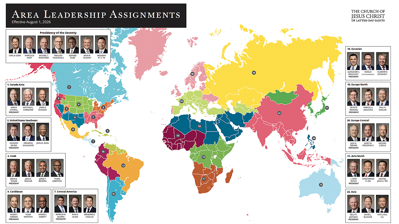 Die Erste Präsidentschaft der Kirche Jesu Christi der Heiligen der Letzten Tage hat die zuständige Führung der Gebiete für 2026/2027 sowie Anpassungen bekanntgegeben, die eine verstärkte Unterstützung der Gebietspräsidentschaften vorsehen, um den Bedürfnissen einer wachsenden Kirche besser gerecht zu werden.Diese Änderungen treten am 1. August 2026 in Kraft.