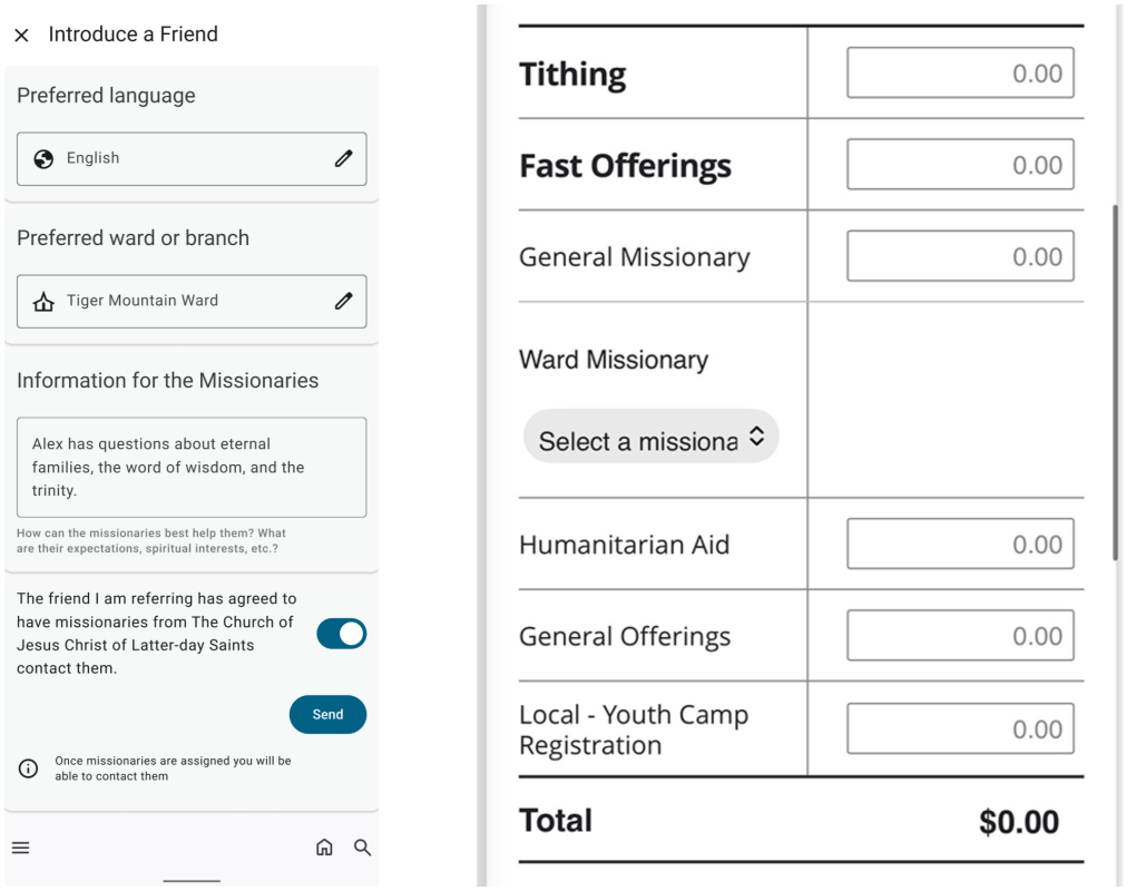 Wenn die Mitglieder in der App die Funktion „Freunde/Bekannte mit den Missionaren bekanntmachen“ verwenden, können sie jetzt beim Einreichen des Formulars eine bestimmte Gemeinde oder einen bestimmten Zweig auswählen (siehe linker Screenshot in der Abbildung unten).