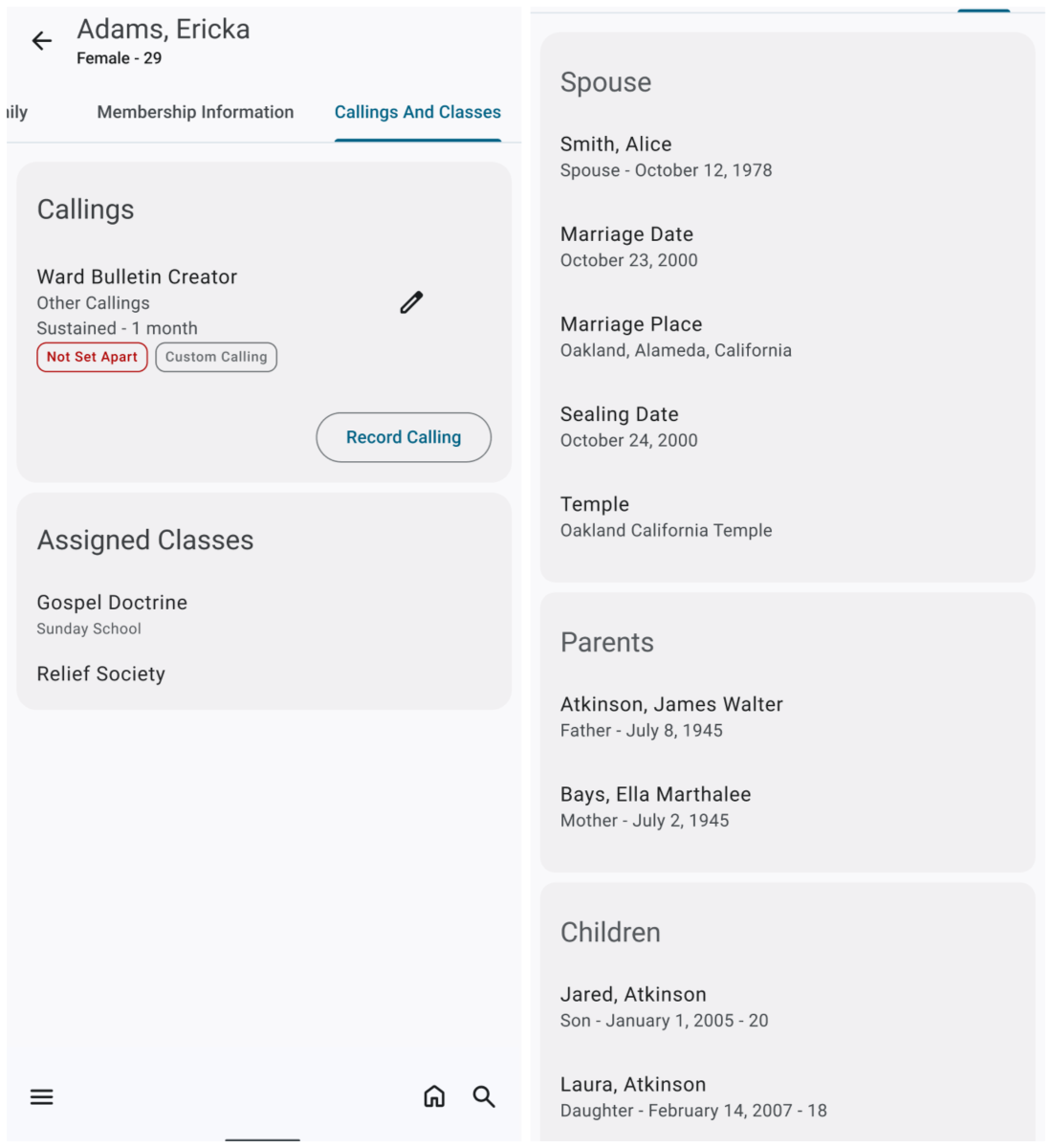 Führungsverantwortliche in Pfahl und Gemeinde können die Berufungen der Mitglieder nun direkt in der App Tools für Mitglieder erfassen und aktualisieren (siehe linker Screenshot in der Abbildung unten). Bisher mussten diese Änderungen über LCR auf der Website der Kirche vorgenommen werden. Jetzt können Führungsverantwortliche Berufungen direkt verwalten, sodass Mitglieder binnen 24 Stunden Zugang zu Funktionen und Hilfsmitteln für ihre neue Berufung erhalten.