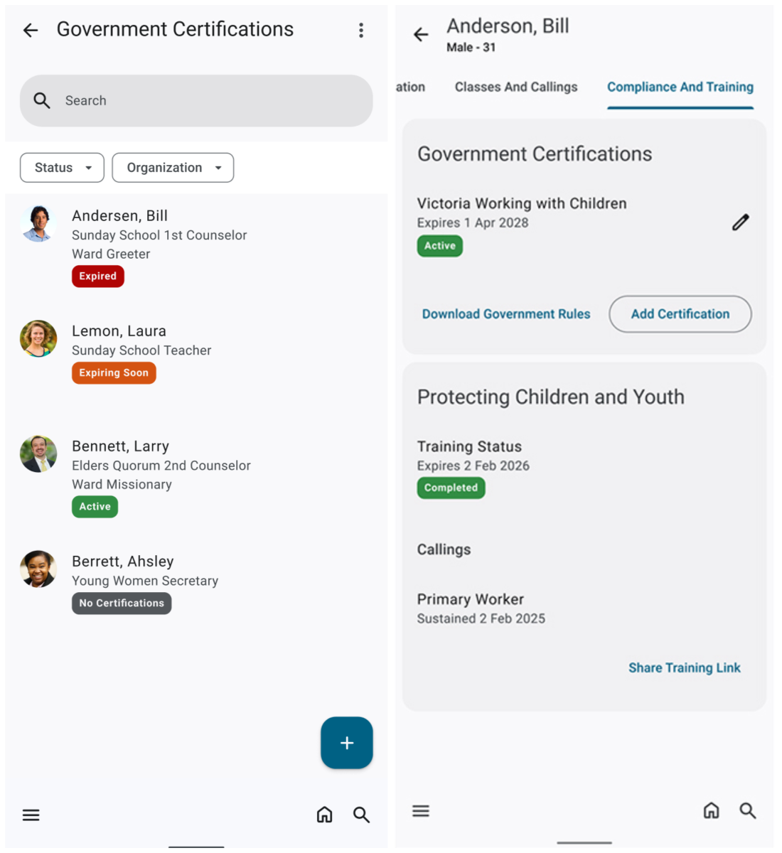 In der neuen Rubrik „Einhaltung von Richtlinien und Schulungen“ im Mitgliederprofil können Bischofschaften, Pfahlpräsidentschaften und Sekretäre Bescheinigungen von Mitgliedern, die mit Kindern oder Jugendlichen arbeiten, einsehen und erfassen.
